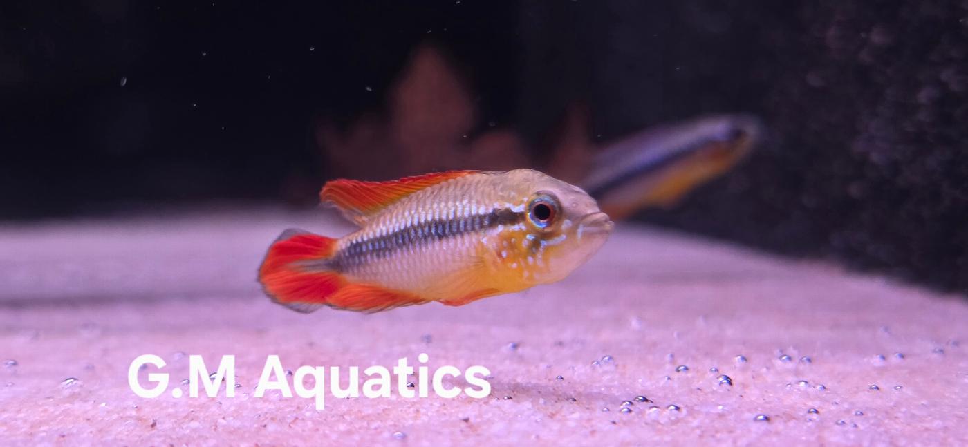 The Apistogramma Agassizii, commonly known as the Double Red Agassiz’s Dwarf Cichlid, is a stunning freshwater fish that originates from the slow-moving waters of South America, particularly in the Amazon River basin. These captivating creatures are a part of the Cichlidae family, known for their vibrant colors and intricate behaviors. The Double Red variety is particularly prized for its striking coloration, featuring a combination of deep reds and yellows that can brighten any aquarium. This species typically reaches a maximum length of about 3 to 4 inches, making them an ideal choice for smaller community tanks. Their natural habitat consists of densely vegetated areas with plenty of hiding spots, which is essential for their comfort and well-being in captivity.