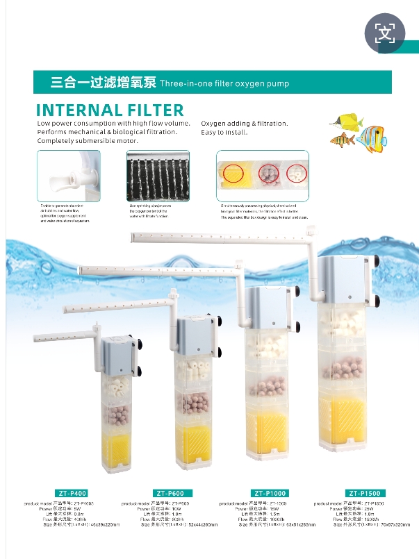 Integrated Functions ZT-P230 8W , 0.8M , 230L/H ZT-P600 9W , 1.10M , 600L/H ZT-P800 15W , 1.50M , 800L/H ZT-P1000 21W , 1.80M , 1000L/H |